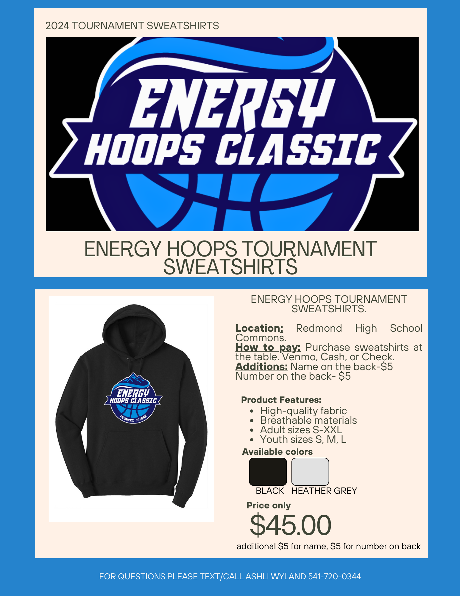 4. Energy Hoops Classic Tourney Sweatshirts can be purchased at Redmond High School all day at the printing station next to admission. Sweatshirts are $45 and name and number are an additional $5 per.