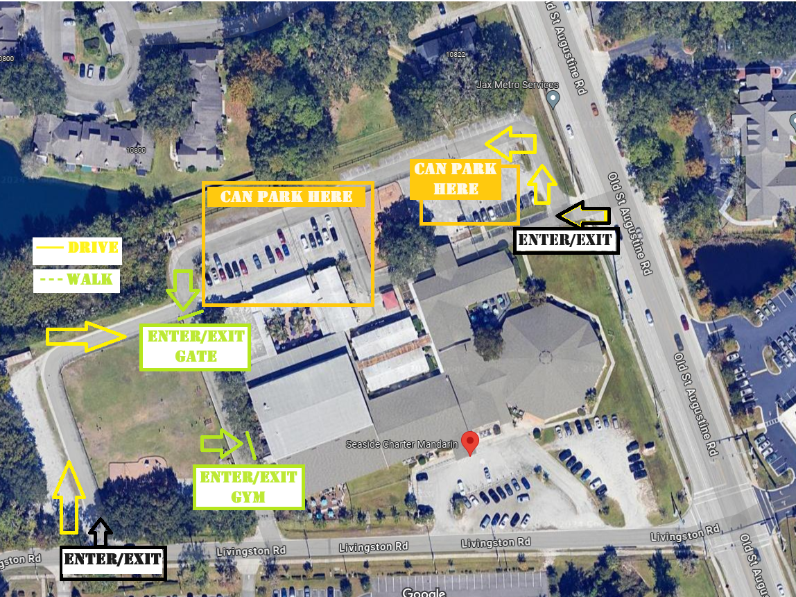 Please use aerial view as a reference for parking and entering the gym.