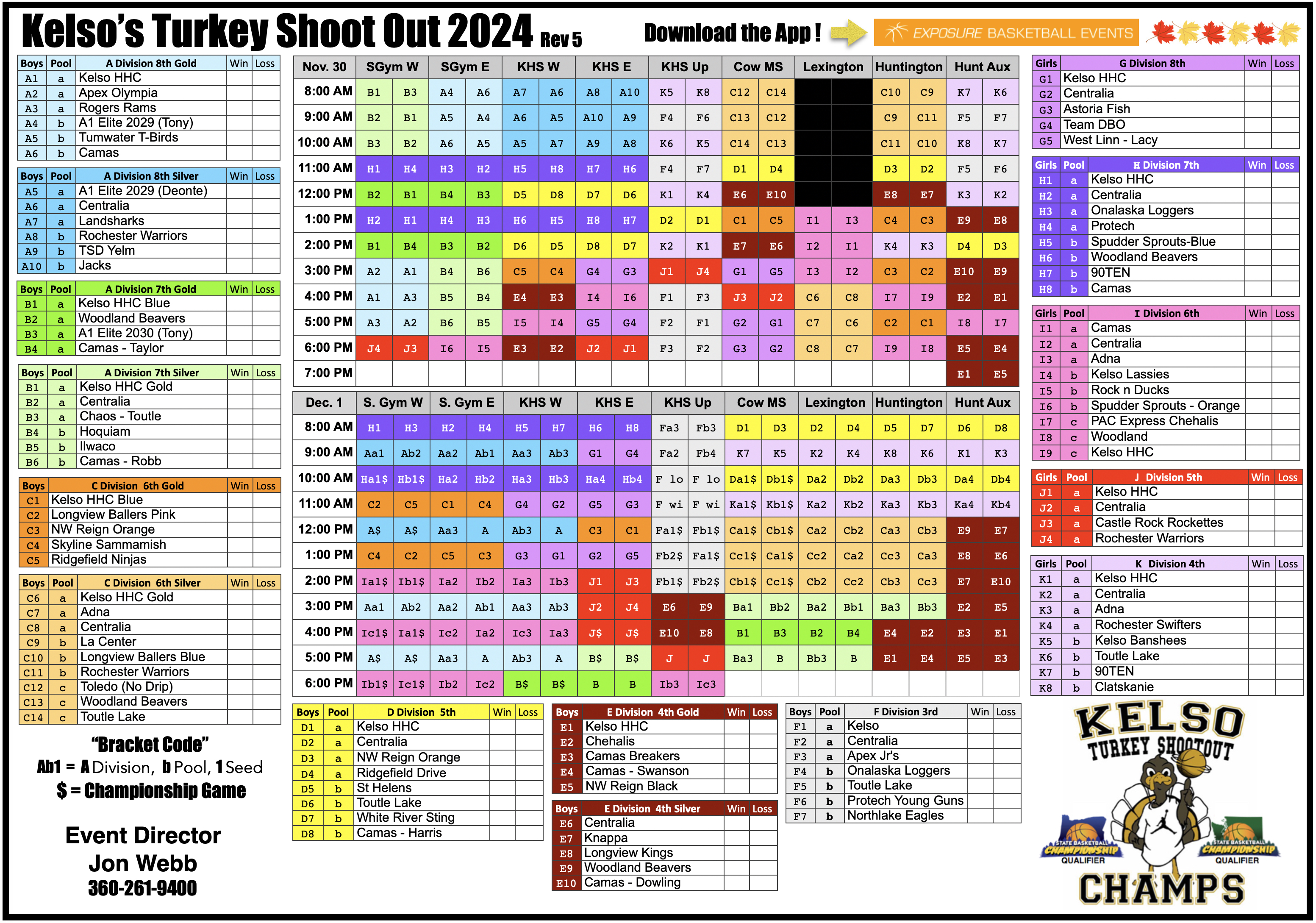 We are kicking of the Kelso Hoops Tourney Series with a bang as 95 teams will flock to gym after Thanksgiving. Saturday game schedule should be out Monday night. Please look over our the Event Rules and Information sheet. Divisions and Pools have been created so please double check those for accuracy.
