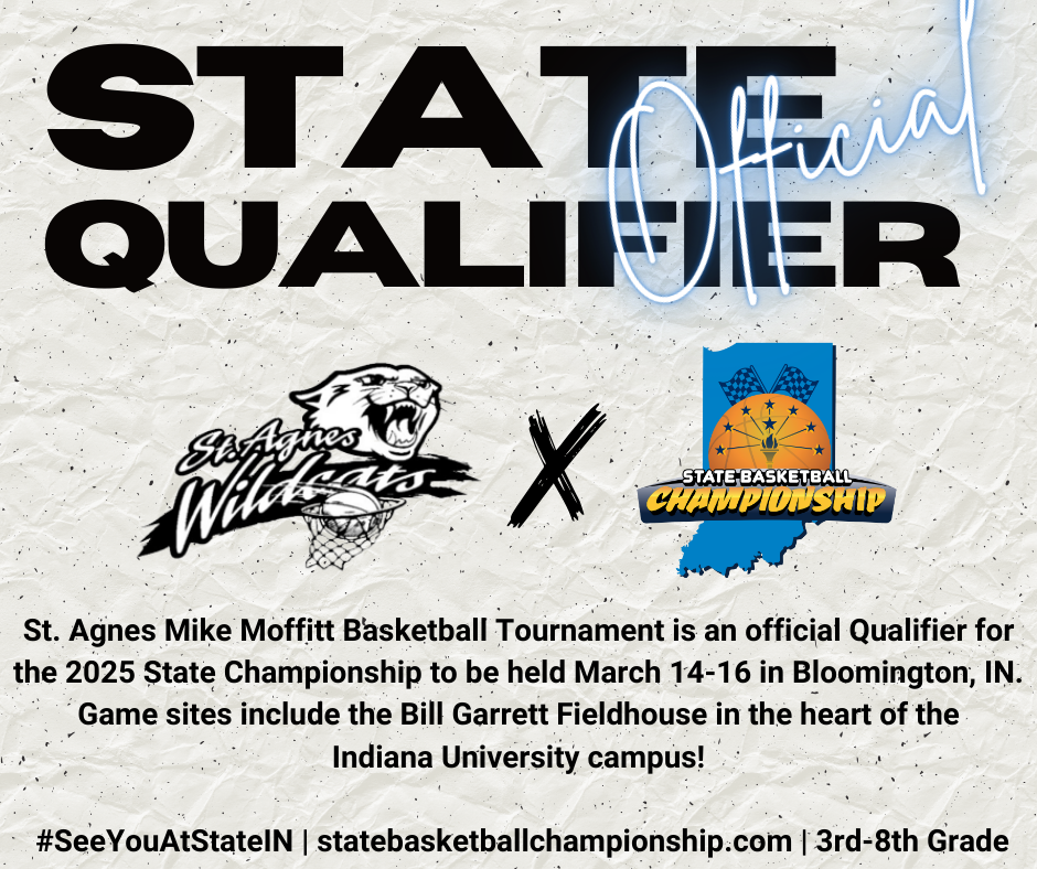 St. Agnes Mike Moffitt Basketball Tournament is an official Qualifier for the 2025 State Championship to be held March 14-16 in Bloomington, IN. Game sites include the Bill Garrett Fieldhouse in the heart of the Indiana University campus!