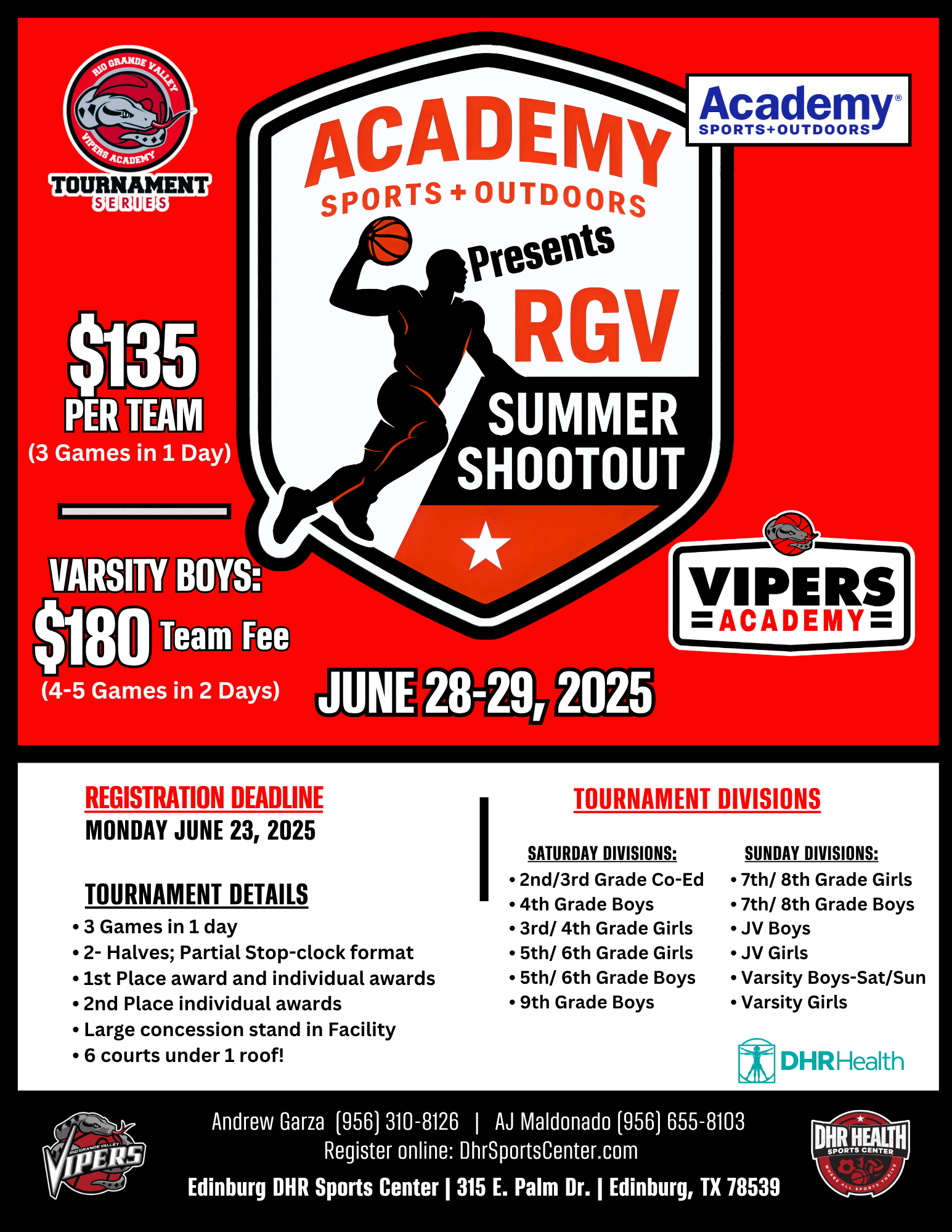 All event related questions should be directed to Andrew Garza at agarza@dhrsportscenter.com or call 956-310-8126.