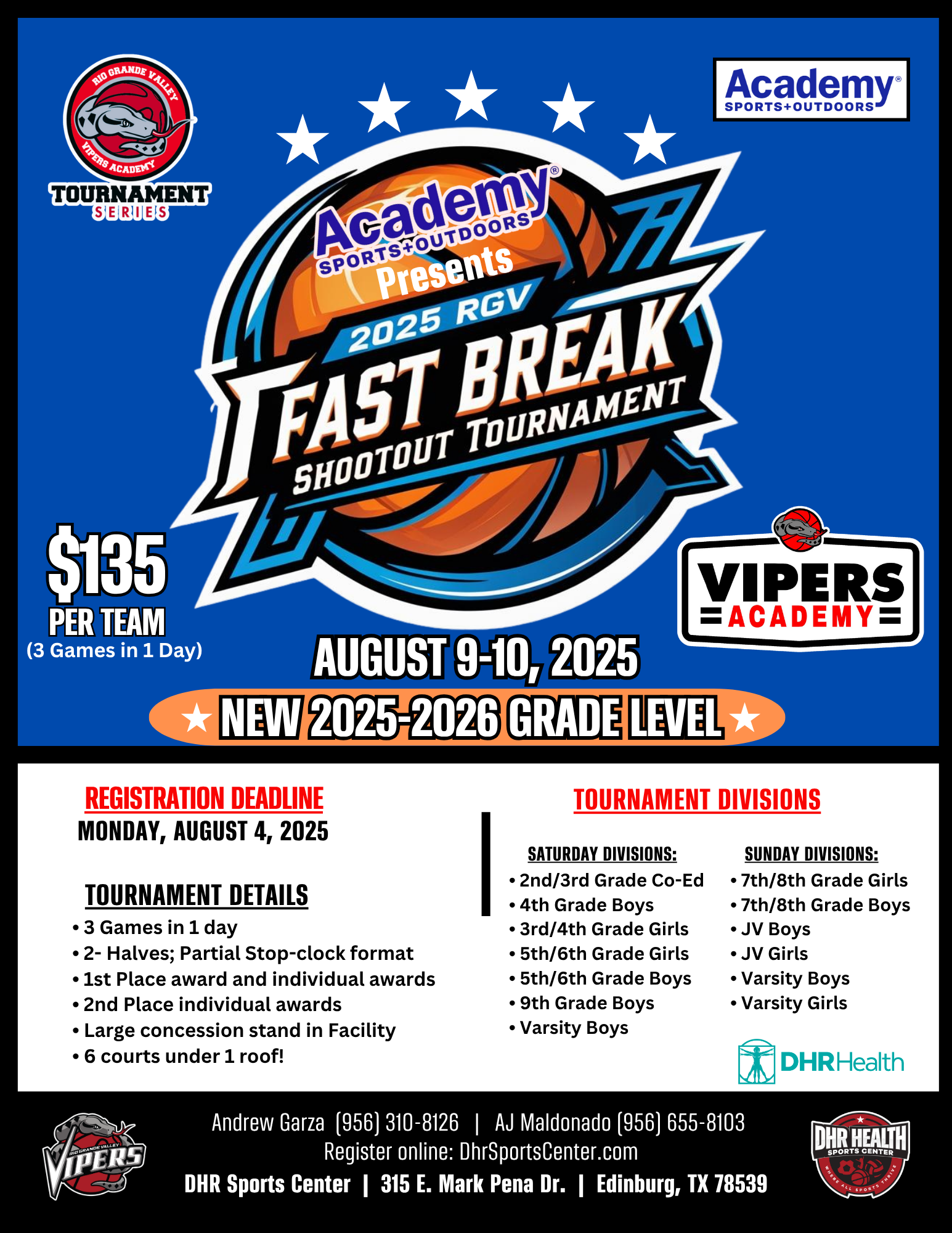 7/30/2025 1:40 PMAll event related questions should be directed to Andrew Garza at agarza@dhrsportscenter.com or call 956-310-8126.