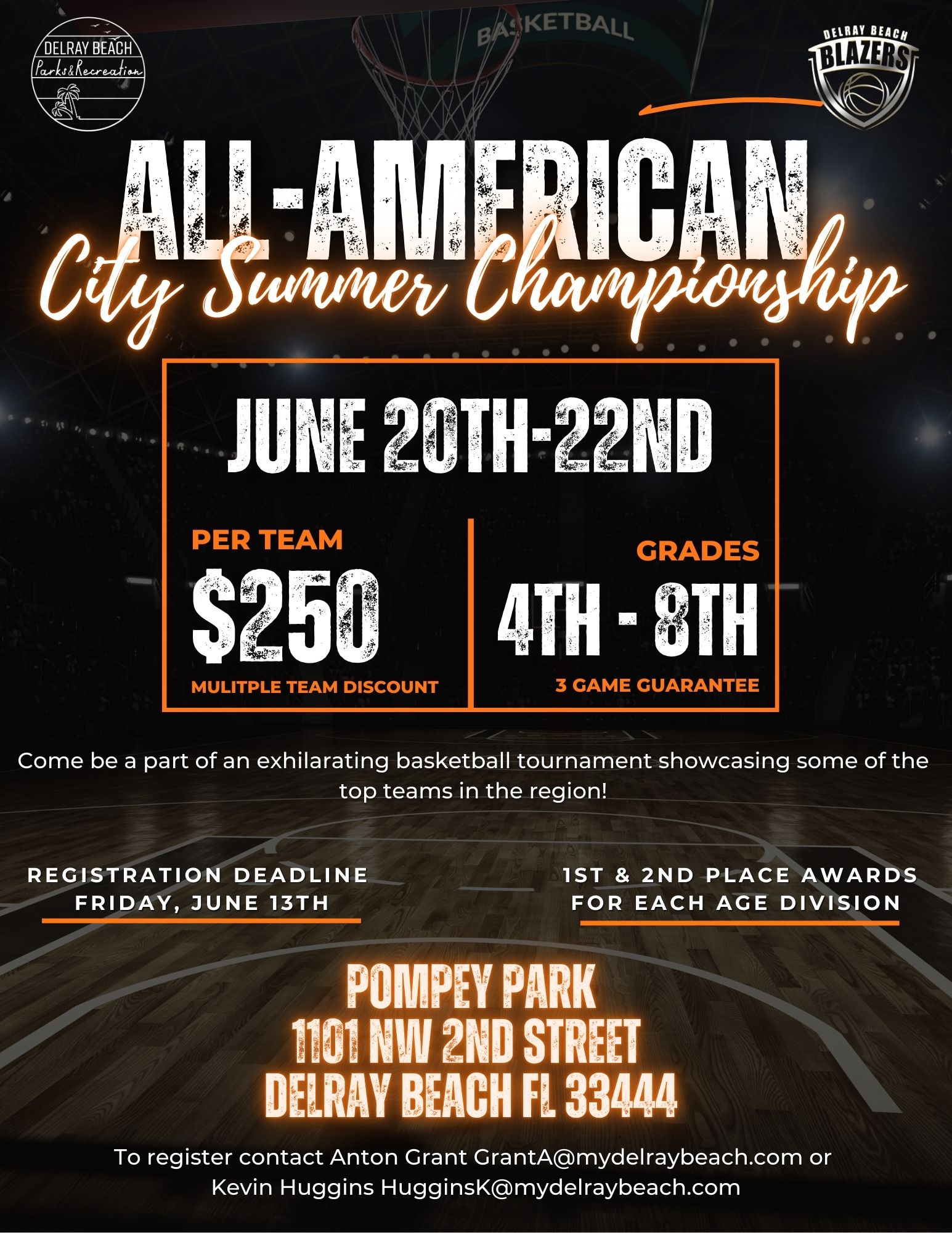 The All-American City Summer Championship is a youth basketball tournament hosted by Delray Beach Parks & Recreation and the Delray Beach Blazers. Designed for players in grades 4th through 8th, the event offers a competitive environment with a 3-game guarantee and awards for the top teams in each division. The tournament will be held at Pompey Park in Delray Beach, Florida, from June 20th to June 22nd. Team registration is $250, with discounts available for multiple teams. The registration deadline is Friday, June 13th. For more information or to register, contact Anton Grant at GrantA@mydelraybeach.com or Kevin Huggins at HugginsK@mydelraybeach.com.