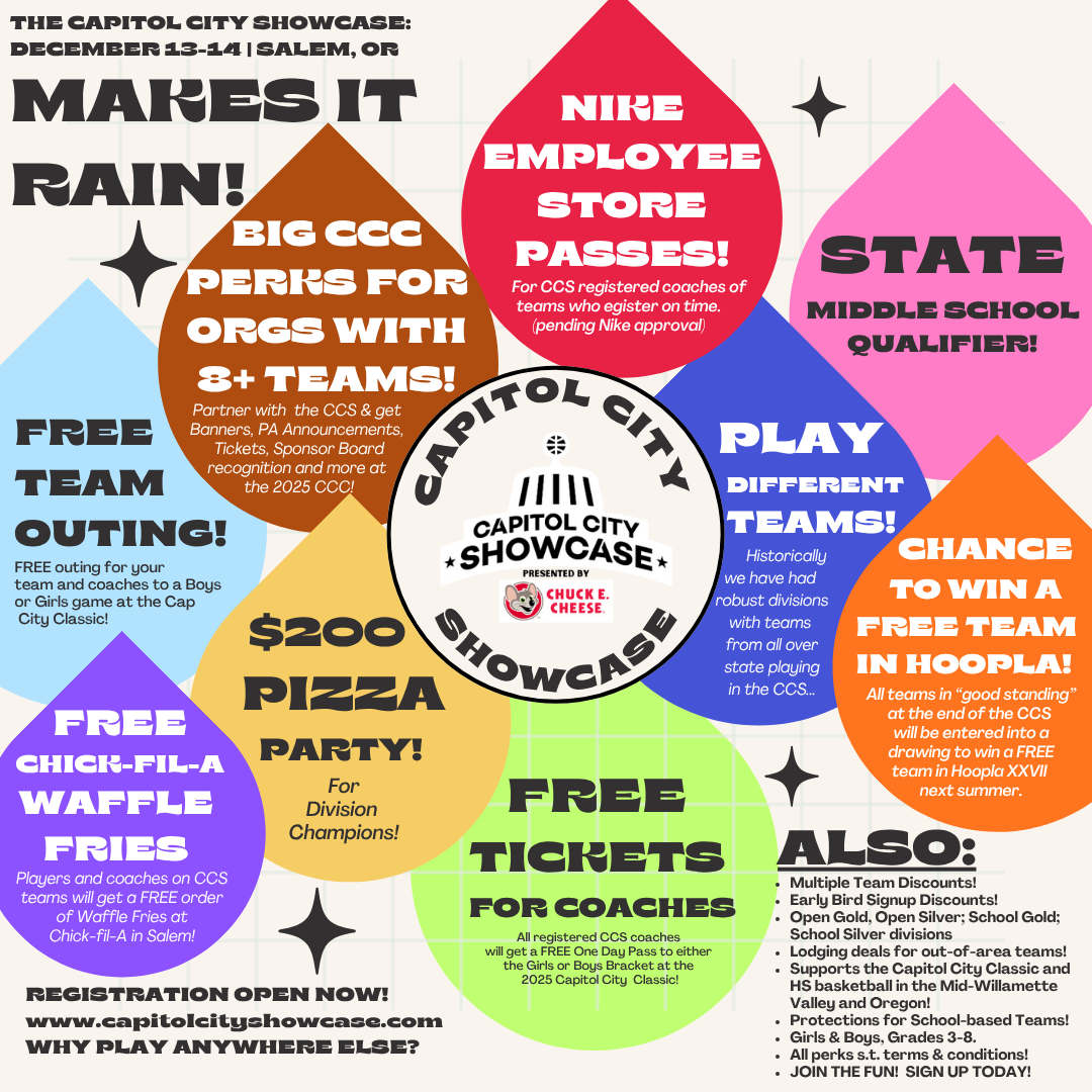 Signing up a good chunk of teams for the CCS? If you fully do so by 9-8, you will get exposure and benefits at the 2025 Capitol City Classic presented at Toyota, one of the best holiday hoops tourneys around - boys bracket at Willamette University, girls bracket at Chemeketa CC.