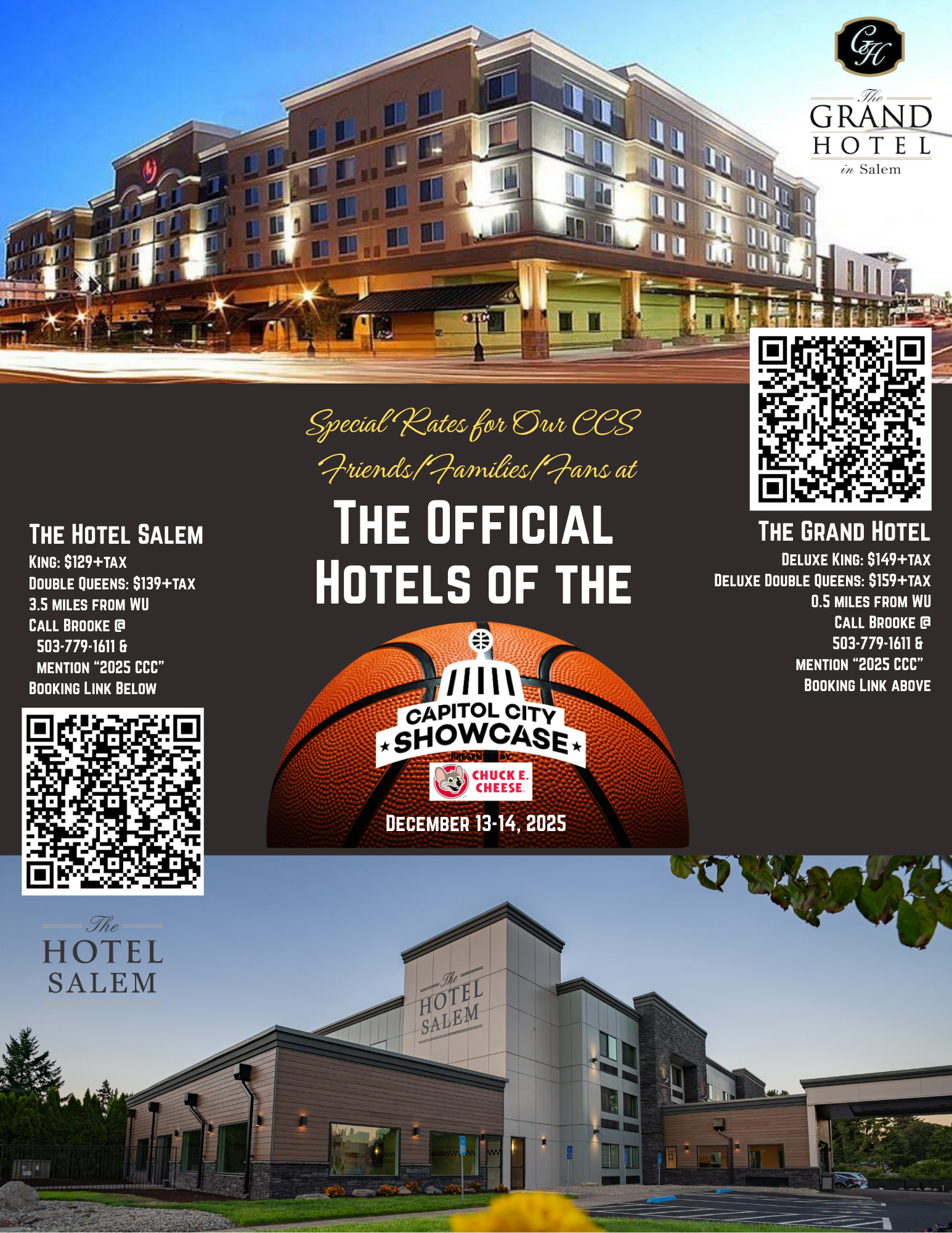 Teams interested in getting SPECIAL RATES from the CCS's Official Hotels - The Grand Hotel in Salem and The Hotel Salem - should call and mention "25 CCS" (referencing Capitol City Classic if necessary) for special rates at GREAT properties in Salem.
