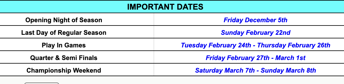 All playoffs brackets are now posted with Play-In Games starting tomorrow. The Home Team is listed on top and will wear White. Home team is also responsible for the Clock & Official Book at the table. Some Venues might have clock keepers but don't count on it. Each Team will be responsible to pay one Official Each before the game.