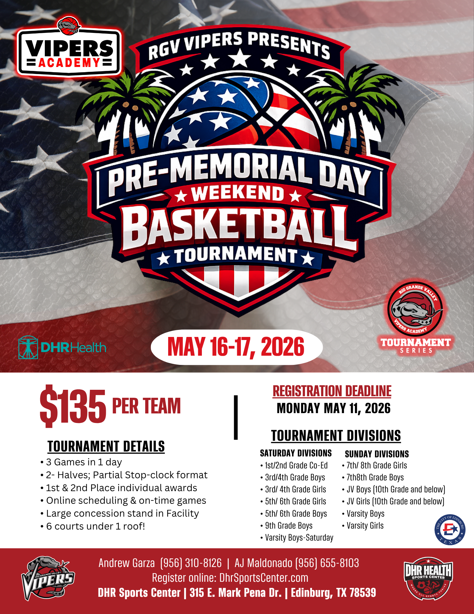 All event related questions should be directed to Andrew Garza at agarza@dhrsportscenter.com or call 956-310-8126.