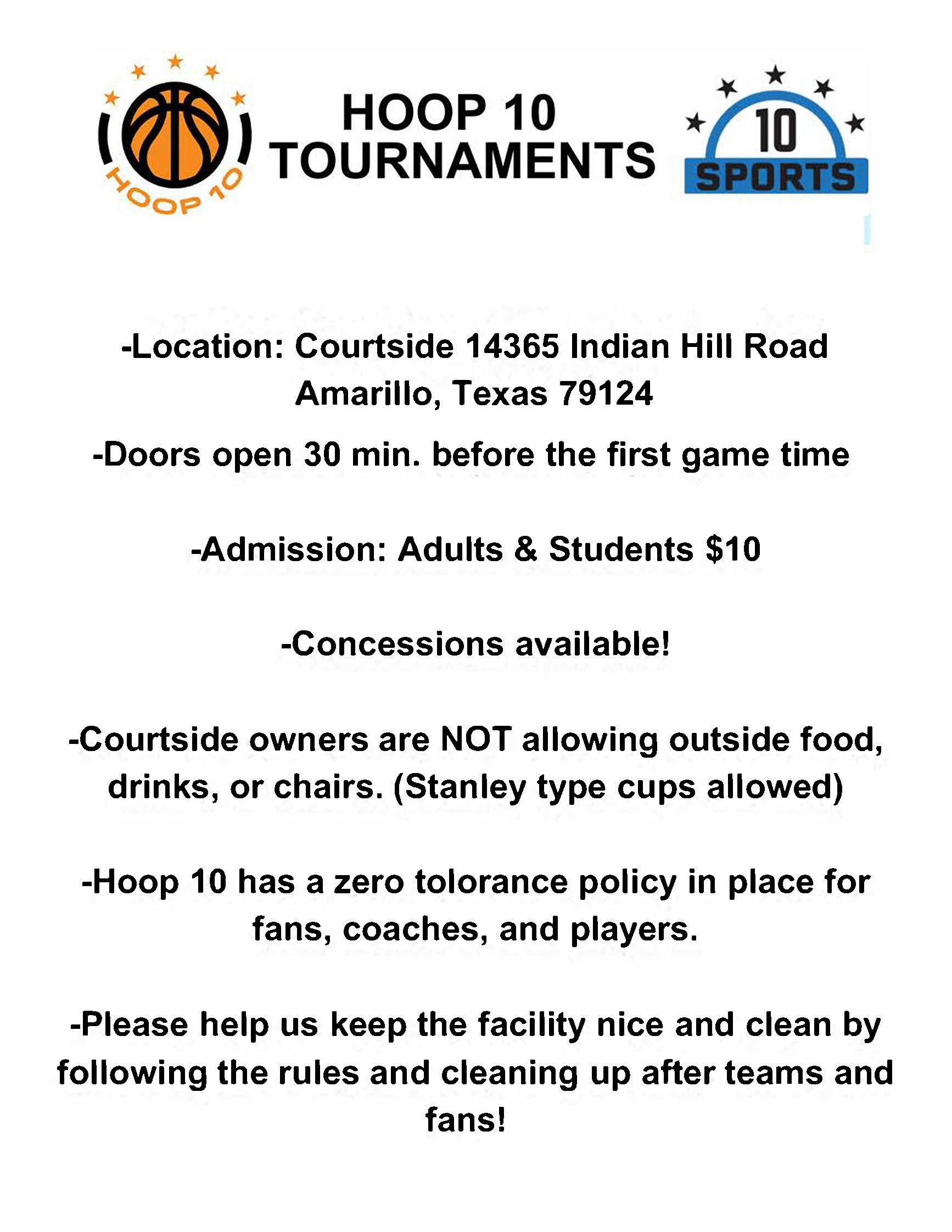 All event related questions should be directed to Clayton Heetland at hoop10basketball@yahoo.com or call 8064772391.